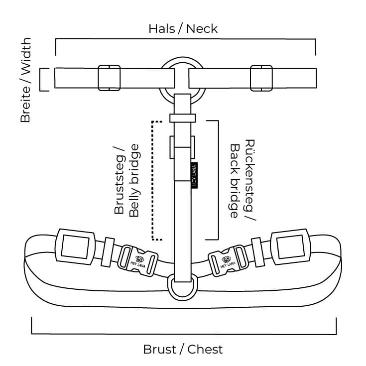 * Der Halsumfang beim Geschirr liegt weiter hinten als ein Halsband und misst ein paar cm mehr.
