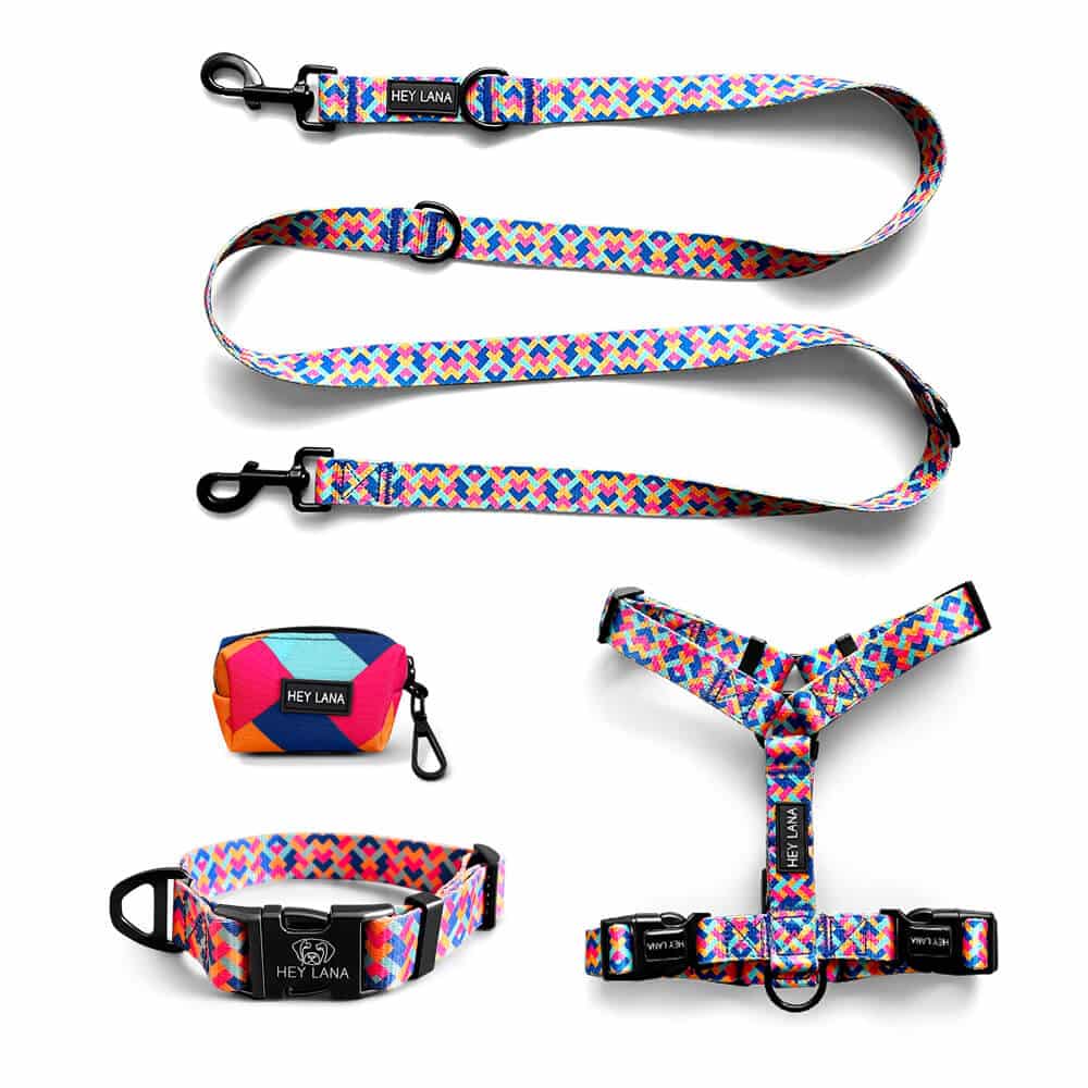 Das Set besteht aus Halsband, Leine, Geschirr und Kotbeutelspender.